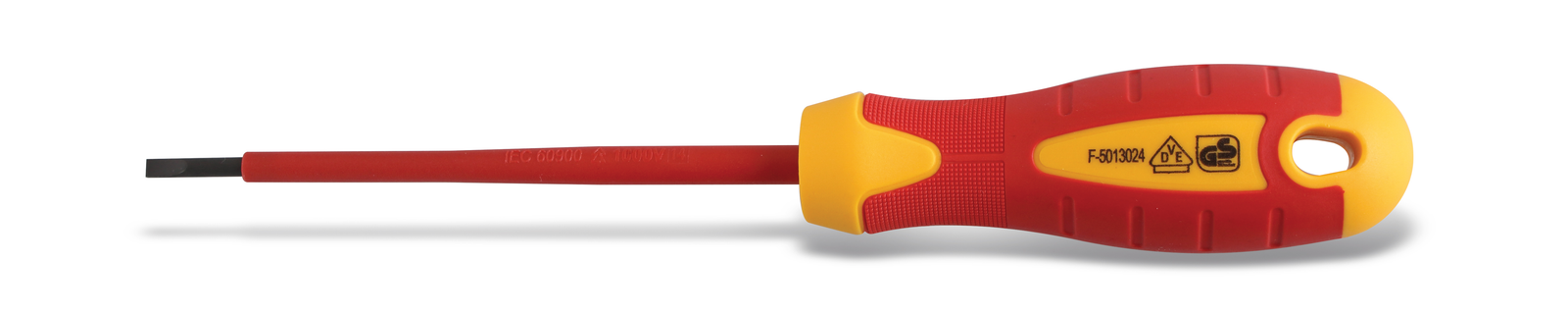 Description Insulated slotted screwdrivers certified for working on live electrical wires at voltage of up to 1000 V. Screwdrivers for slotted screws. Have a single slot in the fastener head. Ground on both sides with a parallel converging profile. Characteristics – compliance with EN 60900 – VDE 1000 V rated – made of high quality S2 steel – durable; deformation and damage resistant – the insulated, magnetic tip increasing work precision and comfort – bi-material handle with specially formed anti-slip surface for high speed torque transfer