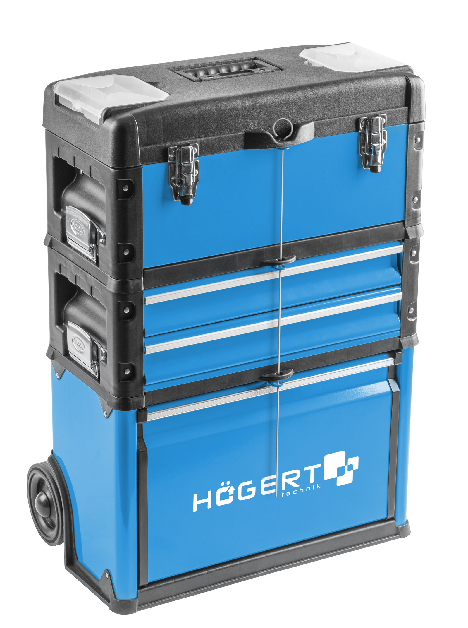 3 dalių modulinė įrankių dėžė ant ratukų. Trys atskiros, modulinės įrankių dėžės su stalčiais ir erdviu skyriumi leidžia laikyti iki 45 kg įrankių. Kompaktiški matmenys, sumontuoti ratai ir teleskopinė sulankstoma rankena leidžia ją gabenti automobiliu ir pristatyti į darbo vietą. Dėl to jis puikiai tinka priežiūros paslaugas teikiančioms įmonėms, automobilių dirbtuvėse, taip pat kiekvieno „pasidaryk pats“ entuziasto garaže. Puikus sprendimas profesionalams, vertinantiems mobilumą, saugumą ir funkcionalumą.