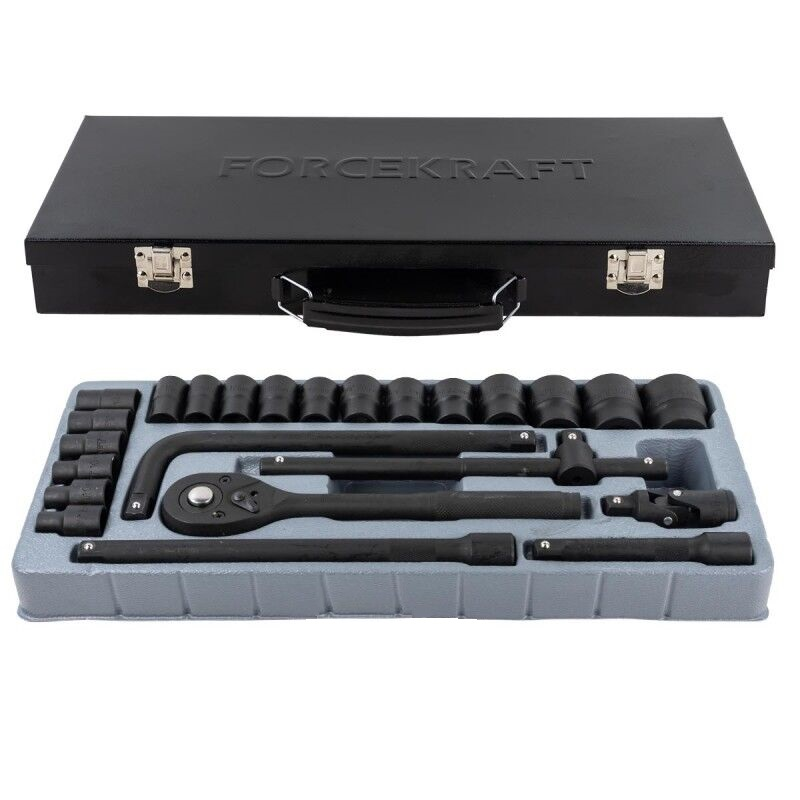 1/2 terkšlė;1/2 prailgintojas 125mm;250mm su slankiojančia jungtim;1/2 L formos raktas 250mm;1/2 kardaninė jungtis;1/2 galvutės: 8mm;9mm;10mm;12mm;13mm;14mm;15mm;16mm;17mm;18mm;19mm;20mm;21mm; 22mm;24mm;27mm;30mm;32mm.
