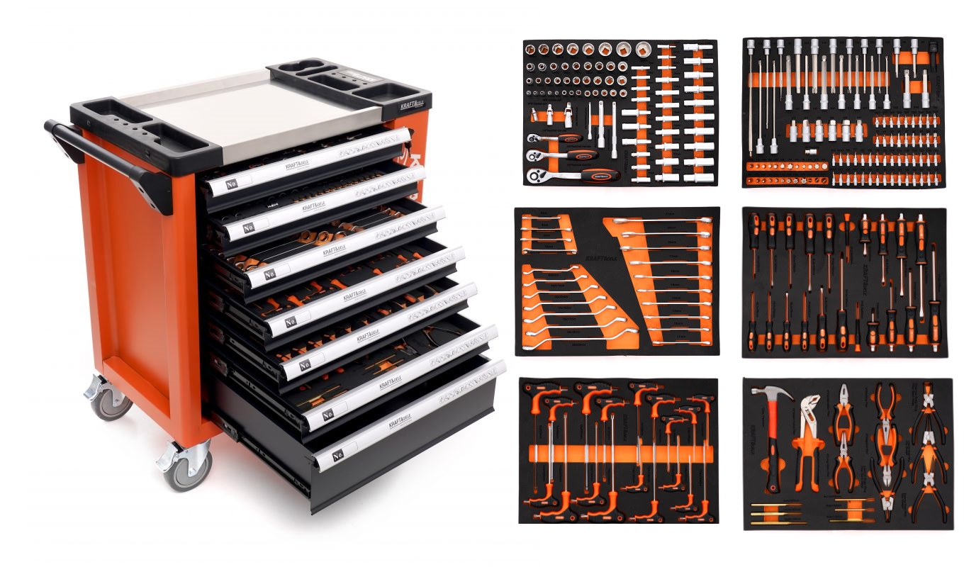 Komplektacija: 6 pilnai sukomplektuoti stalčiai įrankiais, minkštuose EVA dėkluose.Vidutinės kokybės įrankiai.Aukštis: 72cm / 87,5cm su ratukaisIlgis: 76,5cm / 84cm su rankenaGylis: 46cm