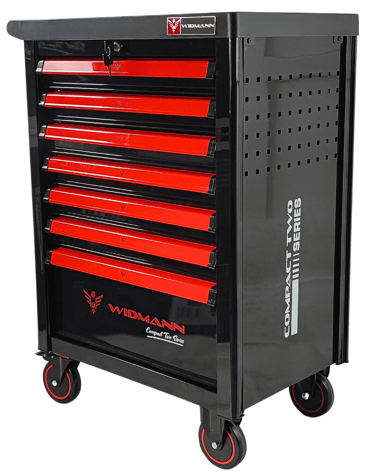 6 Pilni įrankių stalčiaiĮrankiai minkštuose EVA putplaščio dėkluoseNerūdijančio plieno stalviršisDvigubos šoninės perforuotos sienelės Stalčių bėgeliai su guoliaisCentrinio užrakto mechanizmas