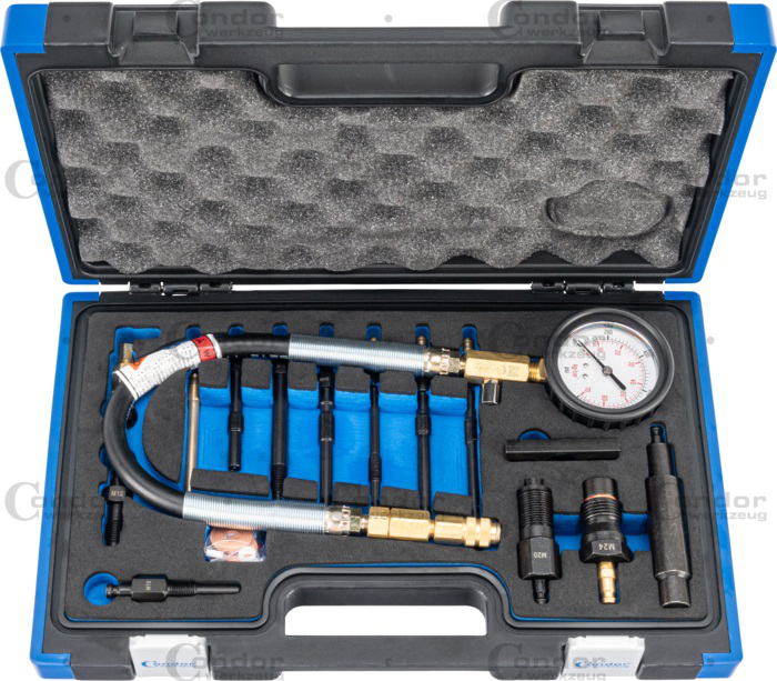 Platus asortimentas, tinka labiausiai paplitusiems dyzeliniams varikliamssu manometru (0-70 bar) ir žarnos jungtimi su greita jungtimi12 adapteriųįskaitant kampinio sujungimo adapterį ir sandariklius