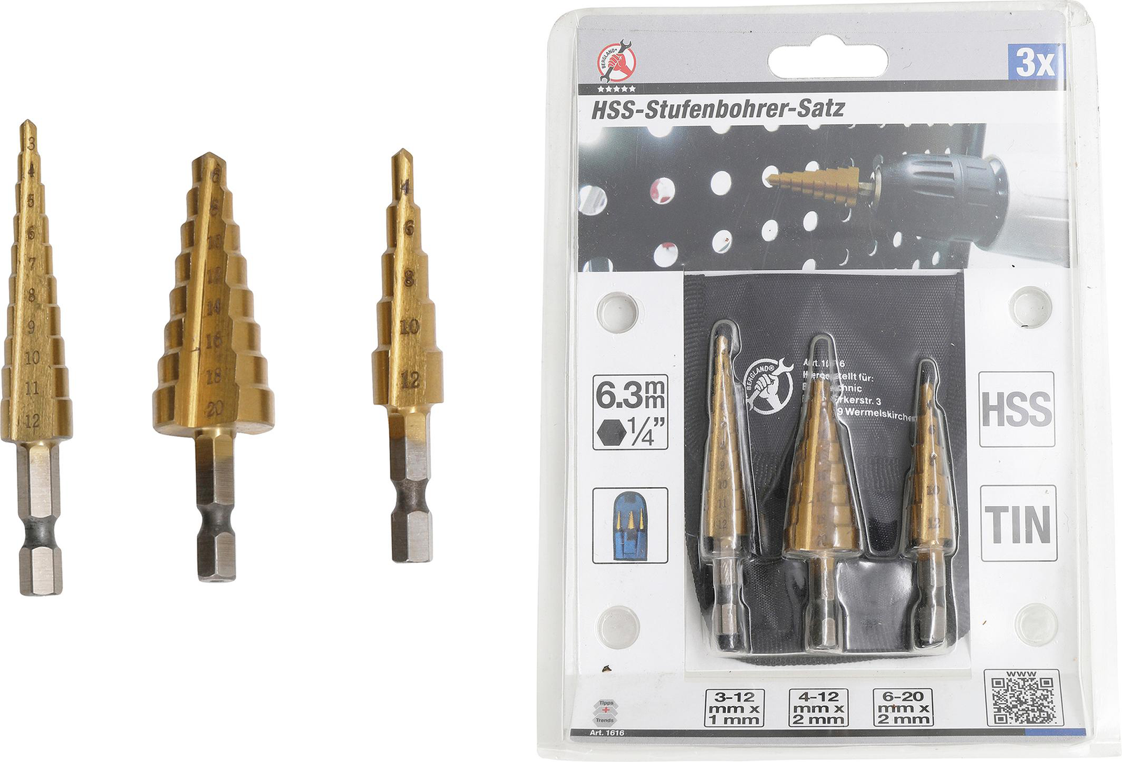 HSS step drill, size 1: 3 – 12 mm, 1 mm stepsHSS step drill, size 2: 6 – 20 mm, 2 mm stepsHSS step drill, size 3: 4 – 12 mm, 2 mm steps