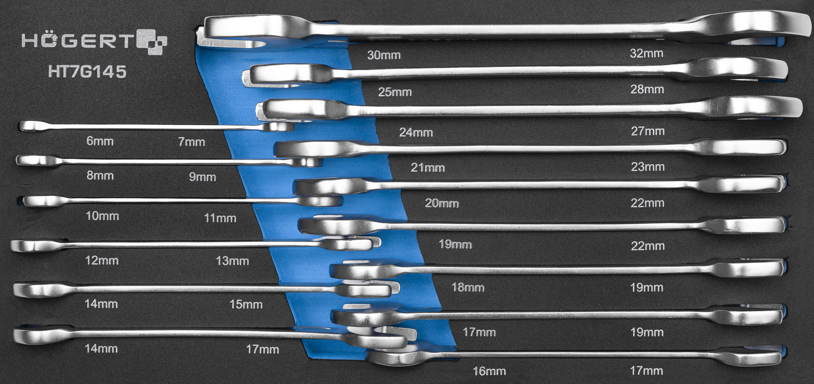 Įrankių spintelės įdėklas su veržliarakčiais, naudojamais skirtingų formų ir dydžių veržlėms ir varžtams atlaisvinti ir priveržti.