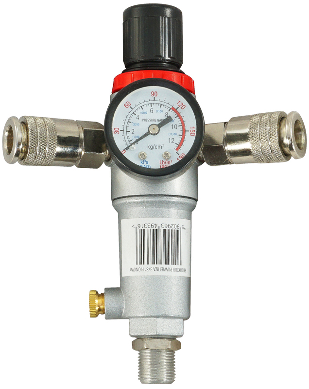 Išorinis tvirtinimo sriegis 3/8" (apie 16,5 mm)Manometras, sugraduotas barais ir psiManometro skalė 0-12 bar (0-180 psi)Reguliavimo diapazonas 0,5-8 baraiDvi greitosios jungtysSlėgio reguliatorius su užraktu