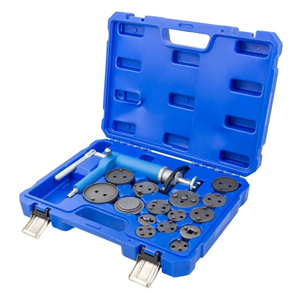 16 dalių stabdžių cilindrų serviso įrankis (pneumatinė pavara) skirtas automobilių suportų cilindrams nuspausti atliekant stabdžių sistemos remontą ir techninę priežiūrą. Rinkinys, skirtas darbui su įvairių tipų stabdžių cilindrais, įskaitant tuos, kurie yra su dešinės ir kairės pusės vairu, gali būti naudojamas aptarnauti įvairias transporto priemones. Rinkinyje yra įvairių įrankių, reikalingų įvairioms stabdžių cilindrų priežiūros operacijoms atlikti, įskaitant dalių išėmimą, montavimą, reguliavimą ir keitimą. Visų reikalingų įrankių turėjimas viename rinkinyje supaprastina ir pagreitina aptarnavimo procesą. Rinkinyje esantys įrankiai pagaminti iš tvirtų ir patvarių medžiagų, tokių kaip aukštos kokybės plienas. Tai užtikrina įrankių ilgaamžiškumą ir patikimumą atliekant stabdžių cilindrų priežiūros darbus. Rinkinį sudaro: 15 adapterių, pneumatinė pavara su kairiuoju ir dešiniuoju sriegiu bei dėklas. Lengvam laikymui ir transportavimui.