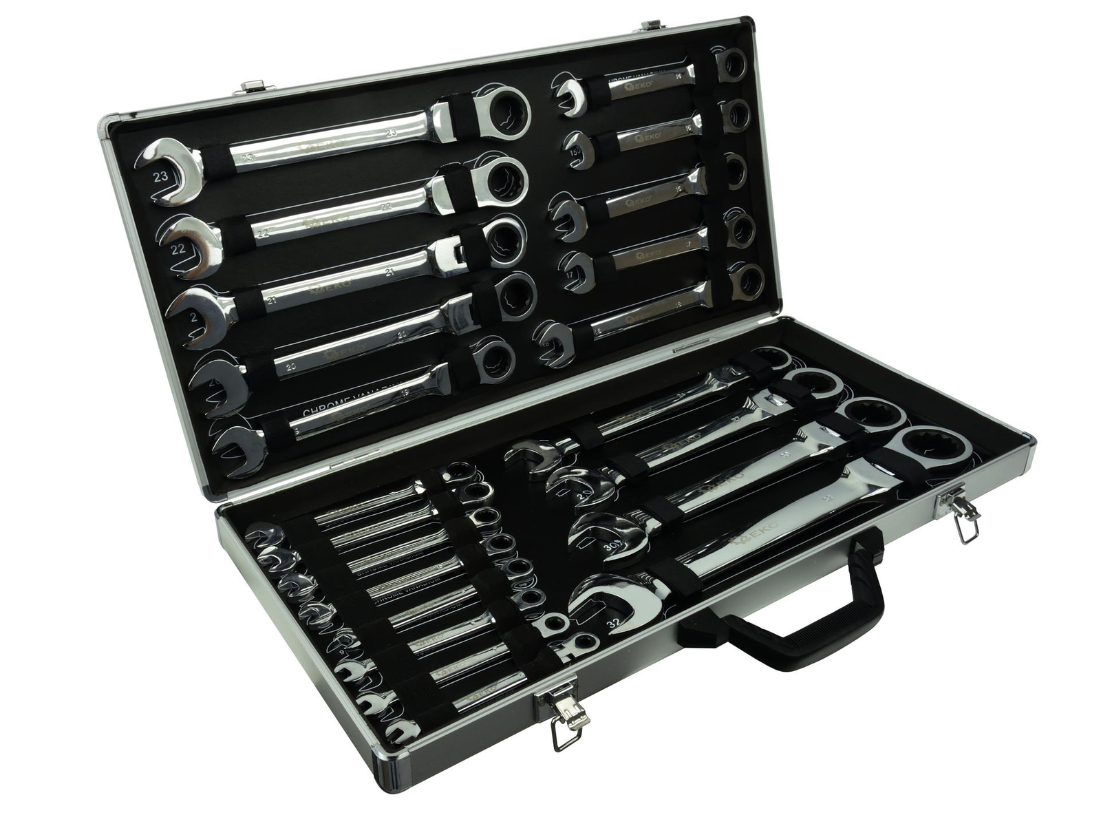 Prekės savybės72 dantų Specialus pavaros dizainas sumažina tvirtinimo detalių apvalinimąPoliruotas chromuotas paviršius maksimaliai apsaugo nuo korozijosRinkinyje yra 22 dalių veržliarakčiai: 6, 7, 8, 9, 10, 11, 12, 13, 14, 15, 16, 17, 18, 19, 20, 21, 22, 23, 24, 27, 30 , 32 mmPridedama aliuminio dėžutė