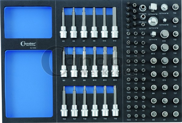 Įdėklo dydis stalčiuje – 3/3 (36x560x395 mm) S2 Chrome-vanadium steel Komplekte: 1/4: Įpresuoti TORX: T8-T30 ( 37mm ) Įpresuoti 6-kampiai: H3-H8 ( 37mm ) Įpresuoti 5-kampiai: TS10-TS50 ( 37mm ) Įpresuoti "-" : 4 / 5,5 / 6,5 ( 37mm ) Įpresuoti PH: PH0 / PH1 / PH2 ( 37mm ) Įpresuoti PZ: PZ1 / PZ2 ( 37 mm ) 1/2: Įpresuoti TORX: T20-T60 ( 55mm ) / T25-T50 ( 100mm ) Įpresuoti 6-kampiai: H7-H19 ( 55mm ) / H5-H12 ( 100mm ) Įpresuoti SPLINE: M5-M14 ( 55mm ) / M5-M14 ( 100mm ) Bitukai 8mm: T20-T60 su skyle ( 30mm ) Adapteriai / perėjimai: Perėjimas 1/4" x 3/8" Perėjimas 3/8" x 1/2" Perėjimas 1/2" x 3/8" Perėjimas 1/2" x 3/4" Perėjimas 3/4" x 1/2" Bitukų laikiklis 1/4" x 1/4" Bitukų laikiklis 3/8" x 8mm Bitukų laikiklis 1/2 x 8mm