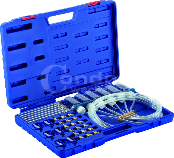 Inhalt: 6 Messkolben 6 Messbecher, jeweils mit Schlauch 70 cm 1 Halteleiste mit Haken 6 Adapter für BOSCH 6 Adapter für SIEMENS 6 Adapter für DENSO 6 Kunststoff-Adapter für DELPHI