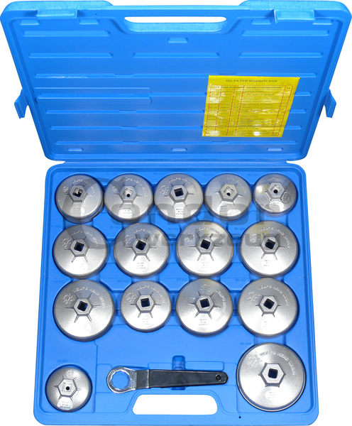 Ölfilterkappen-Satz, 17-tlg. Kappen aus Aluminium-Druckguss mit 27 mm Ringschlüssel und Umschaltknarre 1/2"-Antrieb 15 Ölfilterkappen mit 1/2"-Antrieb und 27 mm Aussensechskant, 64-101 mm