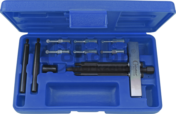 Įrankis guoliui nuimti (vidinis) ø 20-95 mm Aprašymas anglų kalba: Ball bearing remover set for bearings in the clamping range from 20 – 95 mm. The ball cage is destroyed by drilling open and the ball segments are inserted between inner and outer ring, turned through 90° and pulled out with the aid of the crossbar and pressure spindle.