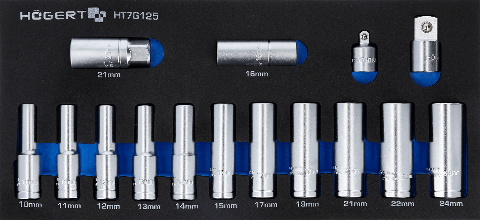 Dėklo dydis – 18 x 39,5 mmKomplekte: 10 – 11 – 12 – 13 – 14 – 15 – 17 – 19 – 21 – 22 – 24 mm (1/2 ilgos galvutės); 16 -21 mm (1/2 žvakinės galvutės); Perėjimai: 1/2 -> 3/8 ; 1/2 -> 3/4