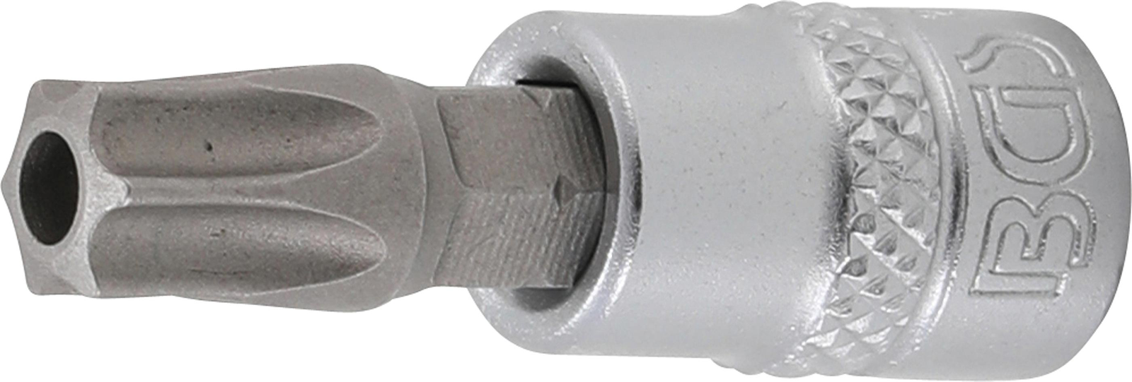 DescriptionknurledTechnical dataDrive profile Internal squareDrive profile size, inch 1/4 "Drive profile size, metric 6,3 mmOutput profile T-Star tamperproof (for Torx)Output profile size T45Surface finish Satin chrome platedMaterial Chrome Vanadium SteelLength 38 mmGross weight 30 gPackaging suitable for wall hanging Yes