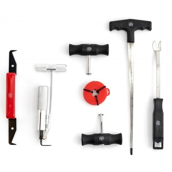 Komplekte yra:Viela su riteVielos suėmimo rankena (2 vnt.)Vielos pravėrimo įrankisApdailos laikiklių nuėmiklisDvipusis peilisRankena su peiliu