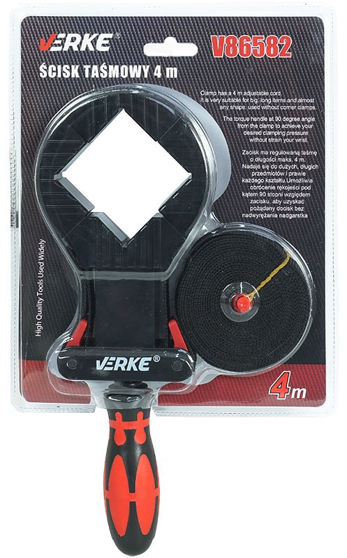 Spaustuvas su reguliuojamu dirželiu, 4m ilgio. Tinka dideliems, ilgiems ir beveik bet kokios formos daiktams. Reguliuojama rankena 90 laipsnių kampu spaustuko atžvilgiu.