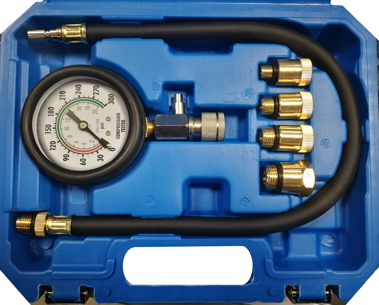 Kompresijos matuoklis 0-300psi (0 – 20 KPa)Srieginis adapteris M18 x 1.5, M14 x 1.25, M10 x 1.0, M12 x 1.25Prispaudžiamas adapterisPlastikinė dėžė