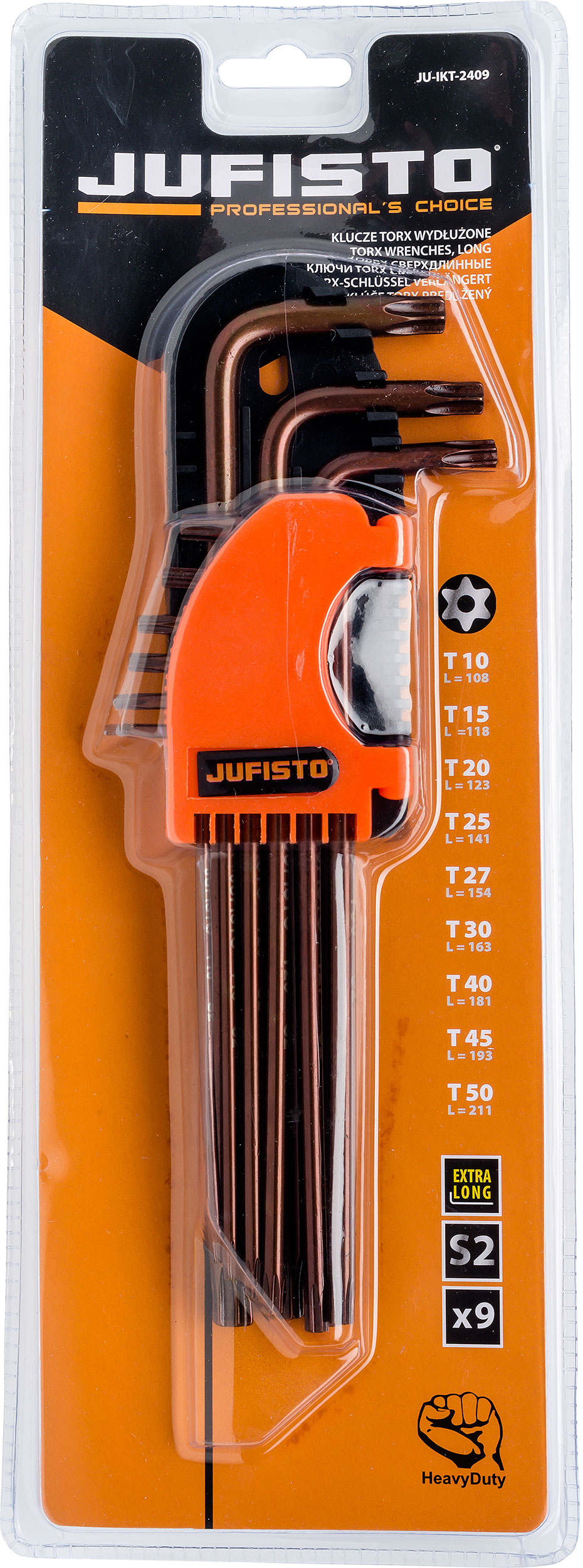 Lenkti TORX raktai su skyluteS2 plienasKomplekte: T10 – T15 – T20 – T25 – T27 – T30 – T40 – T45 – T50