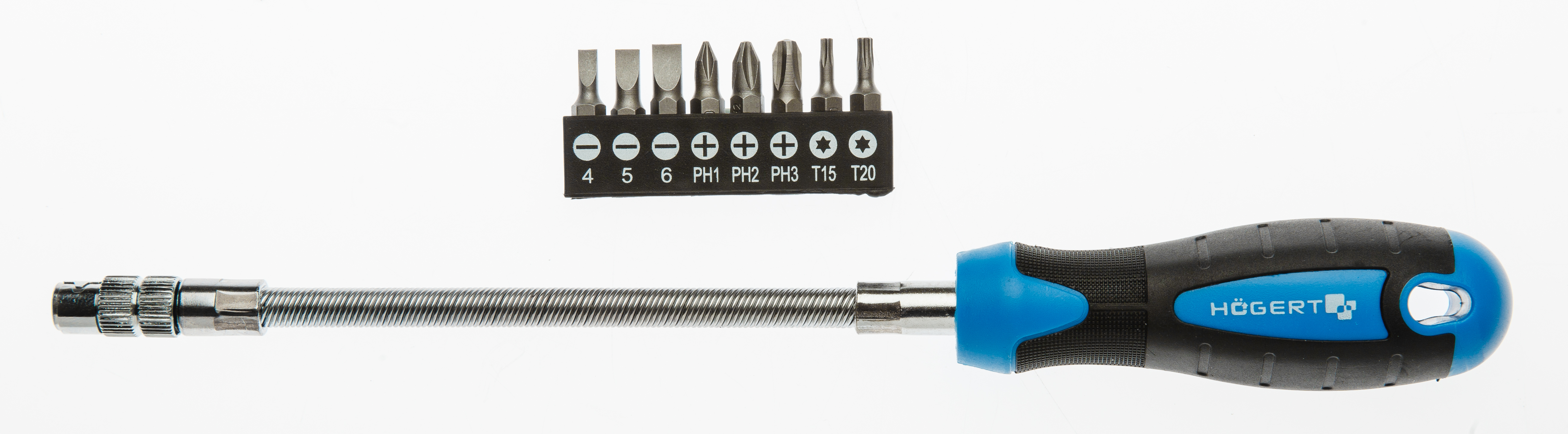 A screwdriver with a 175 mm flexible shaft and a set of bits: slotted bits 4.5 mm and 6 mm, PH1, PH2 and PH3 bits,