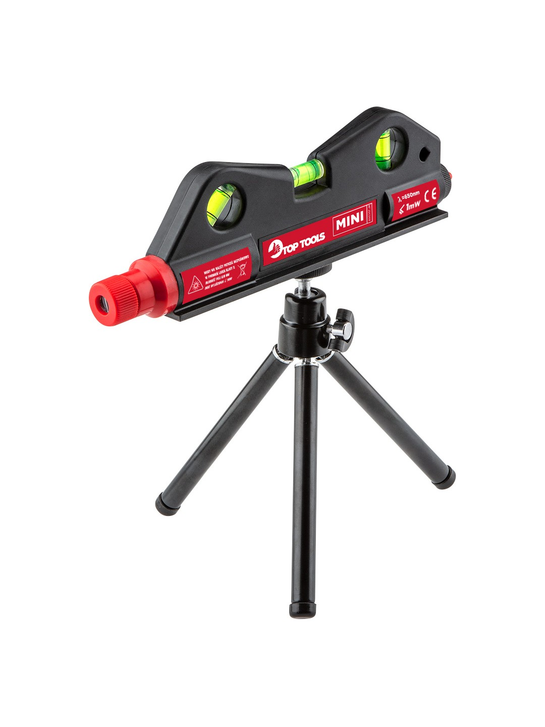 Top Tools mini laser level (ref. no. 29C902) thanks to its size can be used to define level direction in even the most inaccessible areas. 3 vials allow to define horizontal, vertical and 45 degrees tilted planes. The set also includes adjustable mini tripod for greater measurement flexibility. Mini laser level, tripod, laser wavelength 650 nm, laser power ≤1 mW, power supply 2 x AA batteries, CE certificate