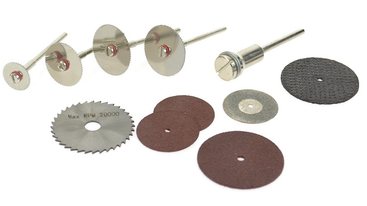 4 metaliniai diskai: skersmuo: 17 mm; 20 mm; 2 x 23 mmHSS diskas 32 mm, storis 0,6 mmStiklo pluošto diskelisDeimantinis diskas3 pjovimo diskeliai: 32 mm; 2 x 24 mm2.35 mm stiebas; HSS koto atrama 3,2 mm