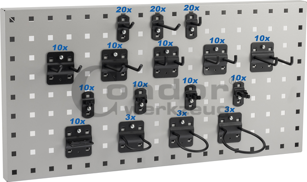 Content:20 x Single Hook, bent hook end 45°, 50 mm20 x Single Hook, bent hook end 45°, 100 mm20 x Single Hook, bent hook end 90°, 35 mm10 x Twin Hook, bent hook end 45°, 65 mm10 x Twin Hook, bent hook end 45°, 95 mm10 x Twin Hook, bent hook end 90°, 35 mm10 x Twin Hook, bent hook end 90°, 50 mm10 x Twin Hook, bent hook end 90°, 75 mm10 x Tool Clamp, 10 mm10 x Tool Clamp, 13 mm10 x Tool Clamp, 16 mm10 x Tool Clamp, 19 mm10 x Pliers Holder3 x Power Tool Holder, 40 mm3 x Power Tool Holder, 60 mm3 x Power Tool Holder, 80 mm