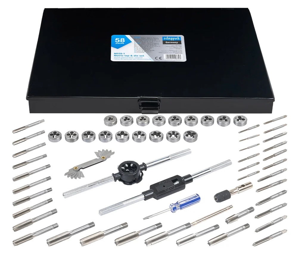 Sriegimo įrankių komplektas (sriegikliai ir sriegpjovės) 58dalių M2-M12 / Scheppach M058-1