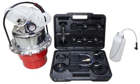 adapteriai stabdžių skysčio rezervuarui – 8 vnt.universalūs adapteriai – 3 vntpanaudoto stabdžių skysčio talpykla su žarna ir guminiu adapteriu