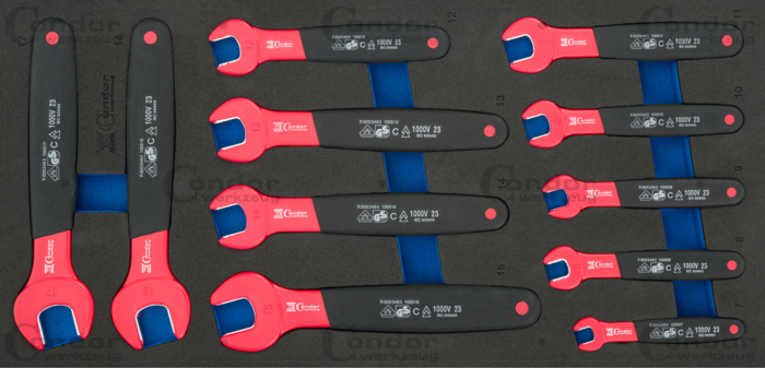 VDE atvirų raktų komplektas 7-17mm dėklas vežimui